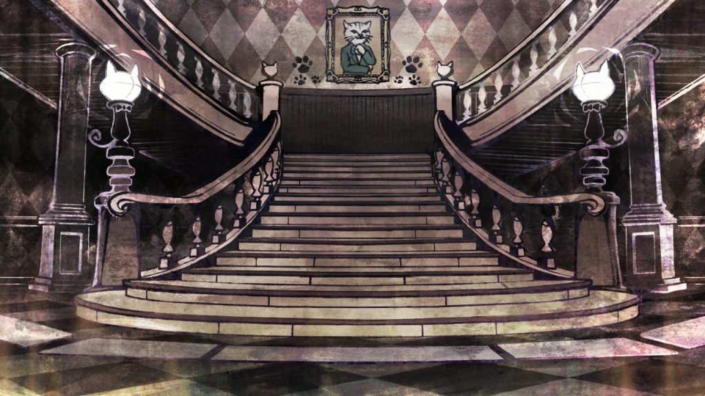招待状を受け取った来客が最初に立ち寄る場所。肖像画の猫が屋敷の主を象徴している。